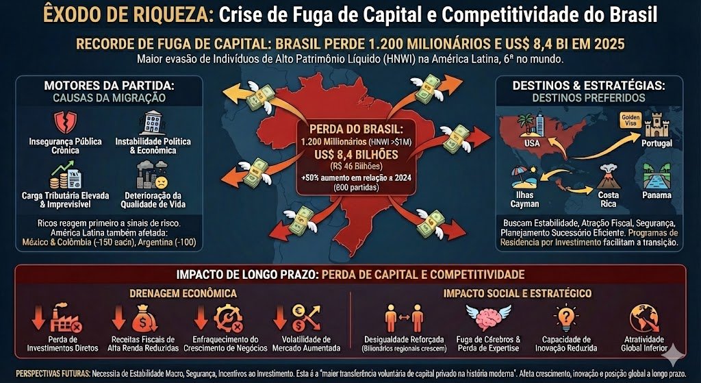 Fuga recorde de capital: Brasil perde 1.200 milionários e US$ 8,4 bi em 2025