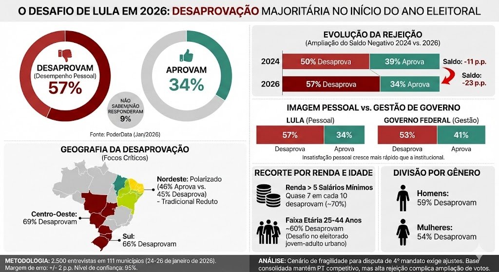 PoderData: rejeição a Lula cresce e chega a 57% no início de 2026